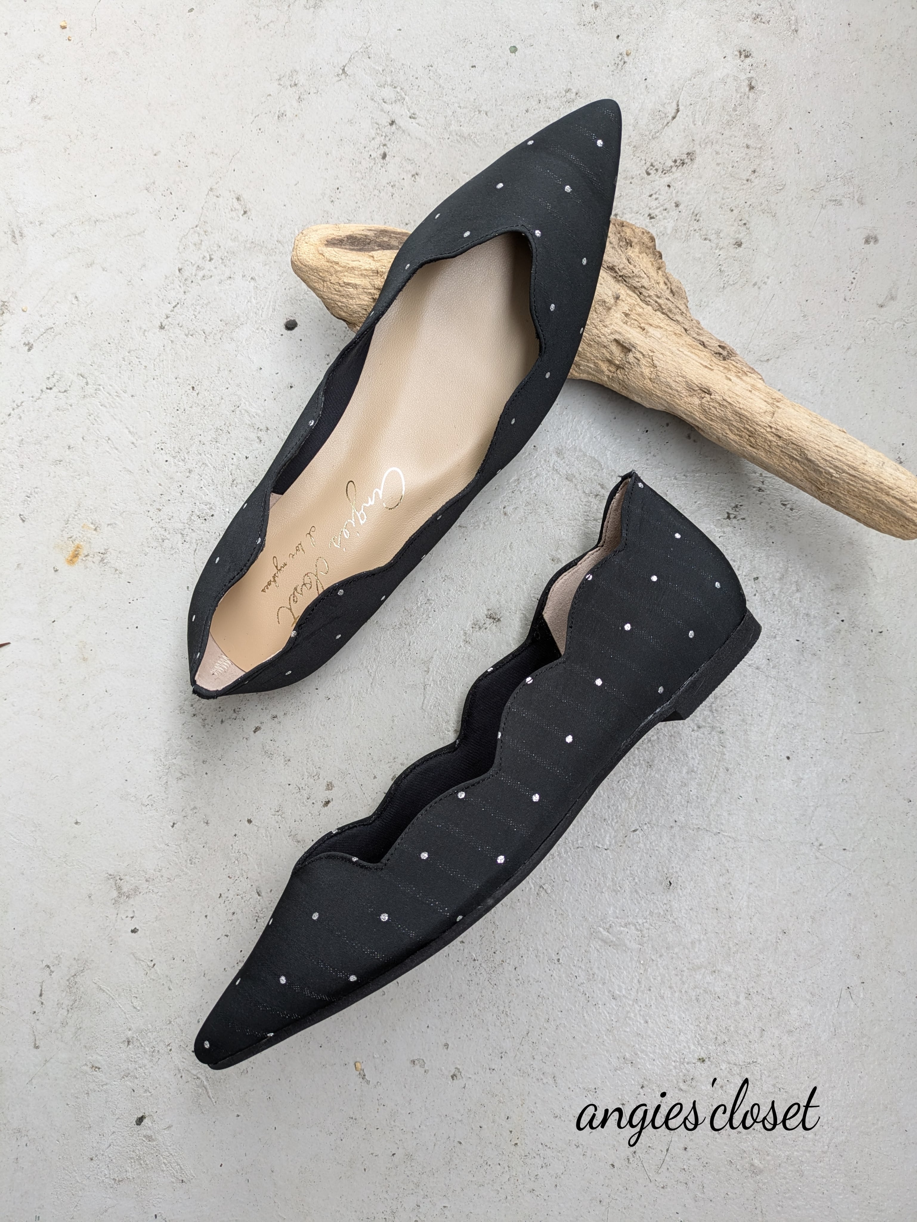 履き口がスカラップ(ホタテ貝)の形をしている可愛いデザインのペタンコパンプス。
